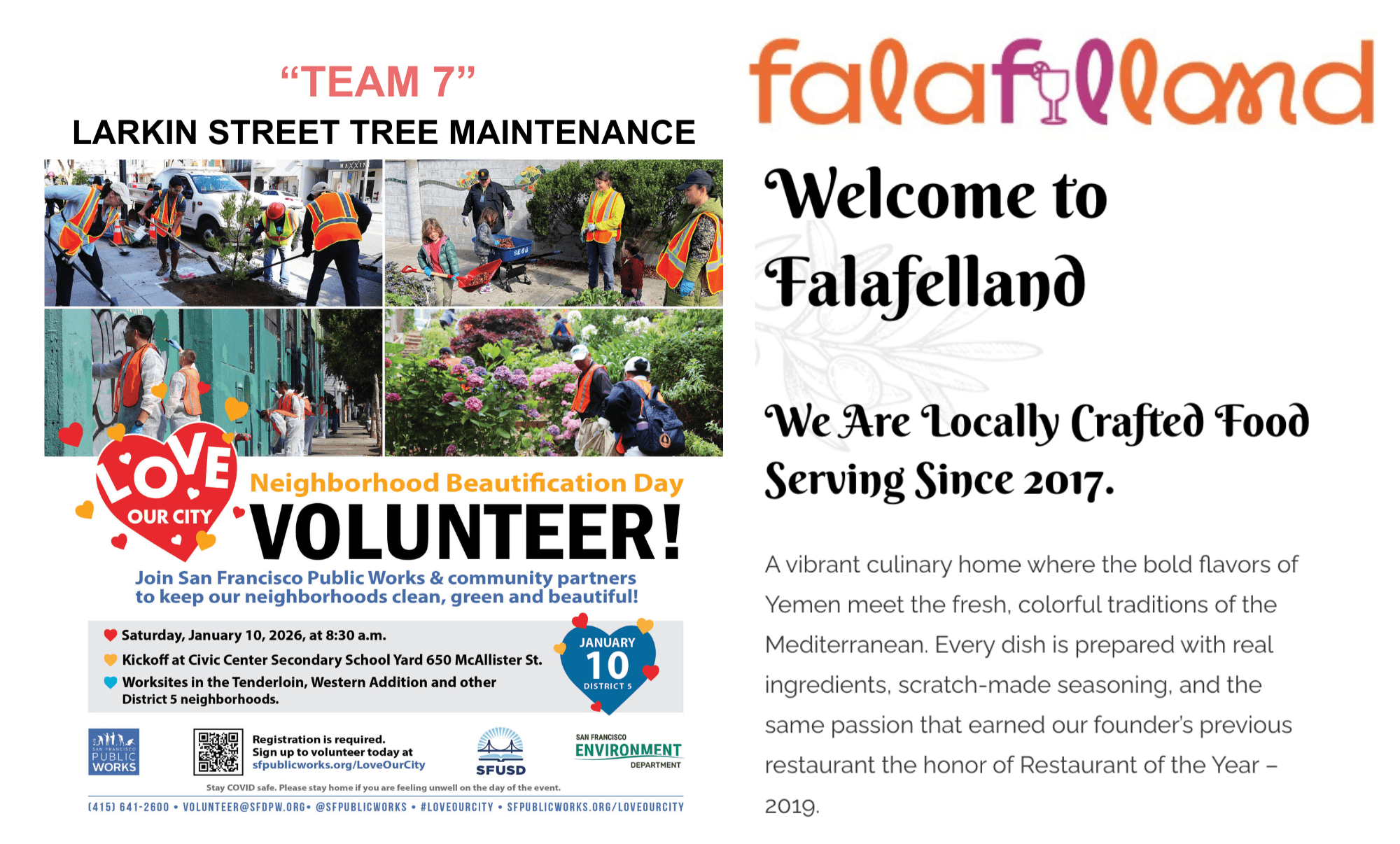 Registration is required through the SF Public Works sign-up form. When registering, please enter “Team 7” as your organization. After the volunteer work is complete, tree planter volunteers will receive SFLuv perks and be invited to help welcome our newest SFLuv merchant, Falafel Land, to the community.